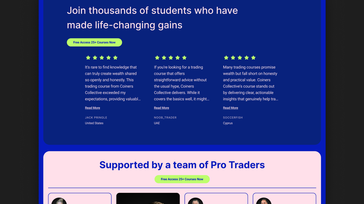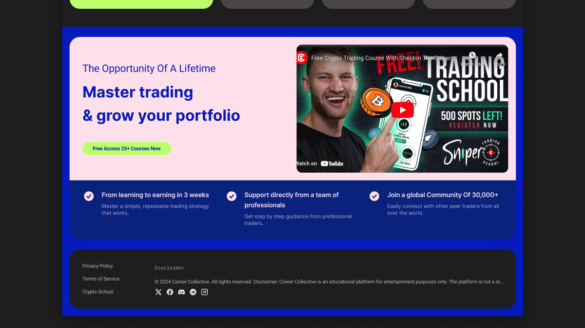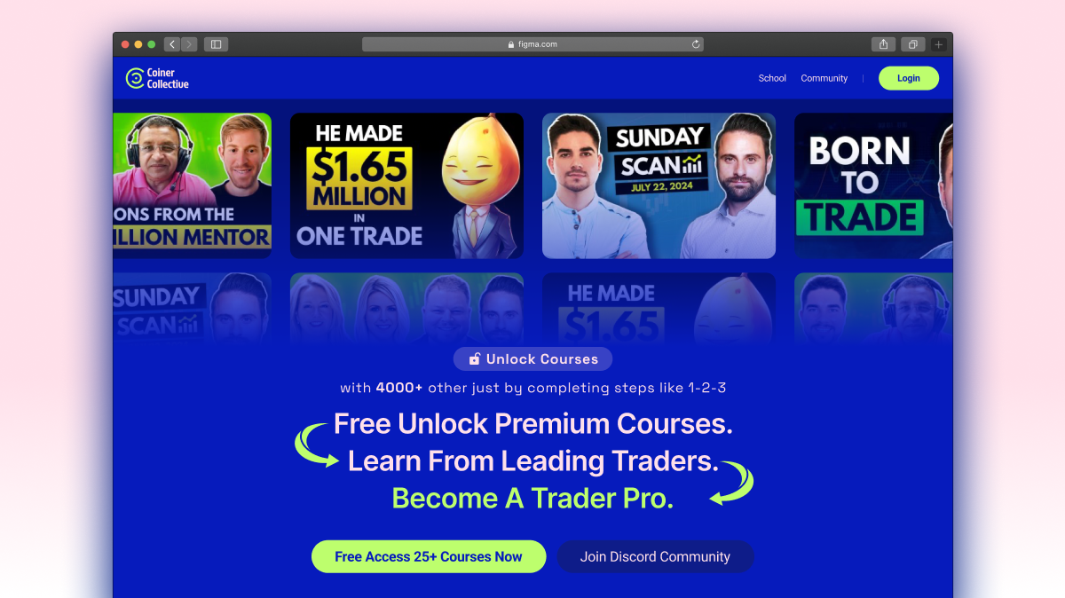Coiner Collective is a trading coaching platform where real coaches, not anonymous signals, lead the way. Multiple mentors with different styles and specialties help traders move from scattered YouTube tips to a structured, guided learning path. Through live sessions, focused lessons, and practical feedback, Coiner Collective turns trading from a lonely, confusing screen activity into a shared craft learned alongside people who’ve been there before.
