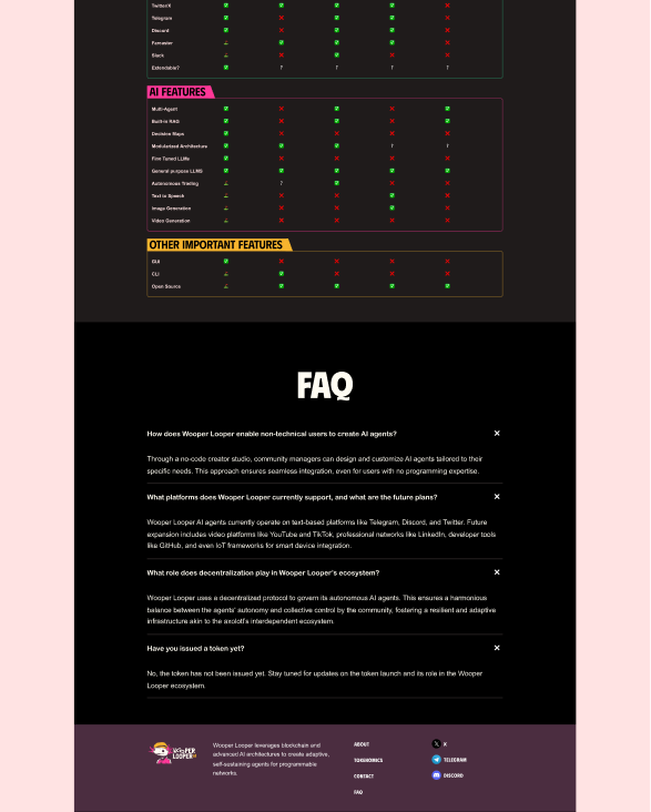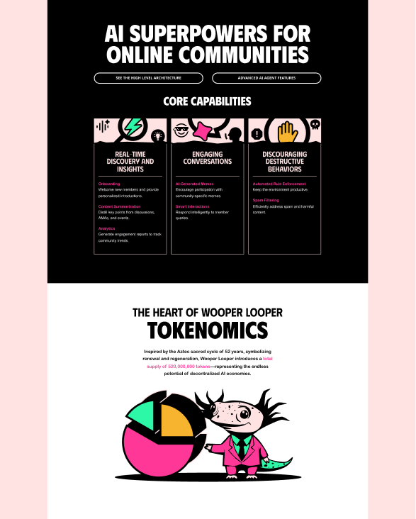 These agents operate autonomously but are governed collectively by the community via a decentralized protocol, ensuring a balance of independence and shared control. Much like the axolotl thrives in its fragile yet interdependent habitat, Wooper Looper forges a blockchain-powered infrastructure where intelligent agents interact, evolve, and create value.